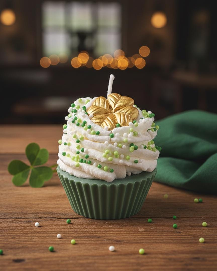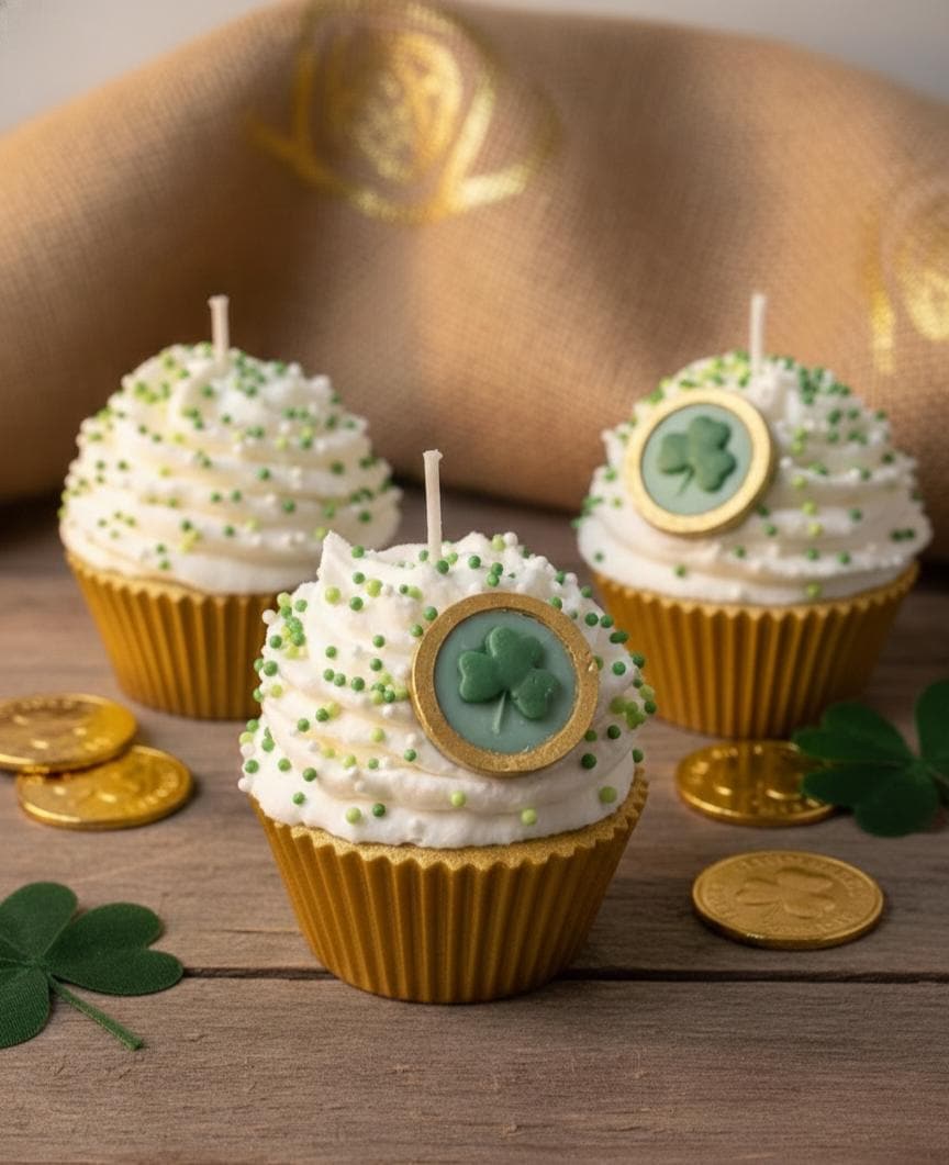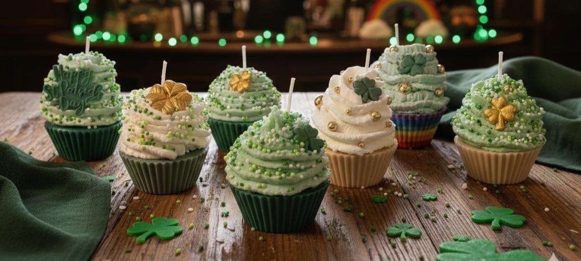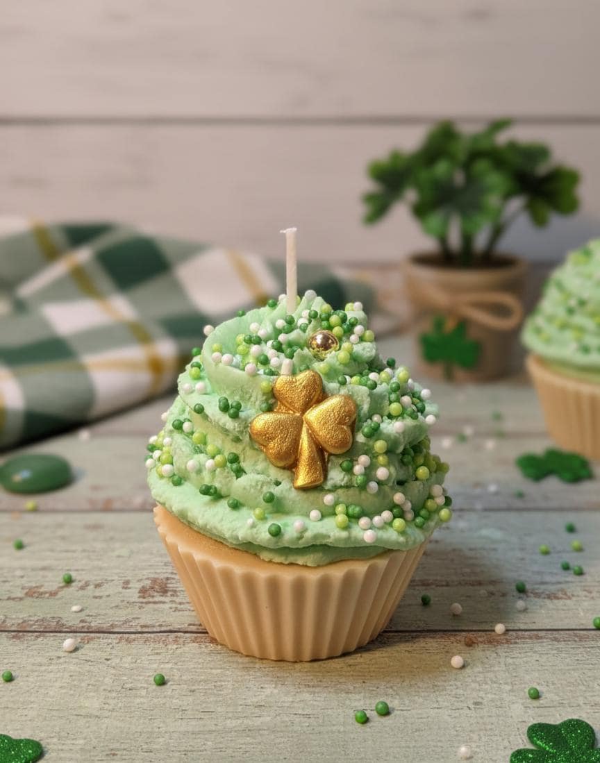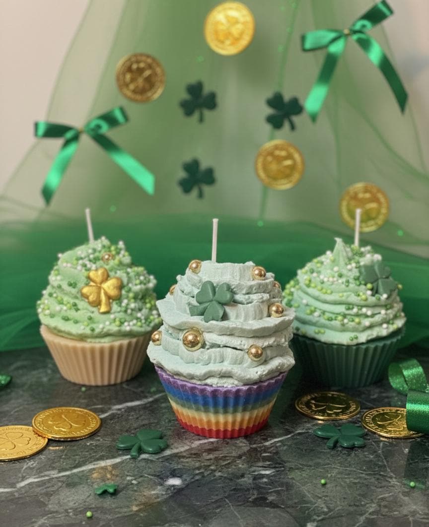 Bring a touch of Irish magic and a whole lot of sweetness to your home this March! These aren't your average cupcakes—they are meticulously hand-poured soy wax candles designed to look (and smell) good enough to eat. From the "pot of gold" rainbow bases to the festive shamrock embeds, these candles are the ultimate treat for your tiered tray, office desk, or as a "pinch-proof" gift for someone special.