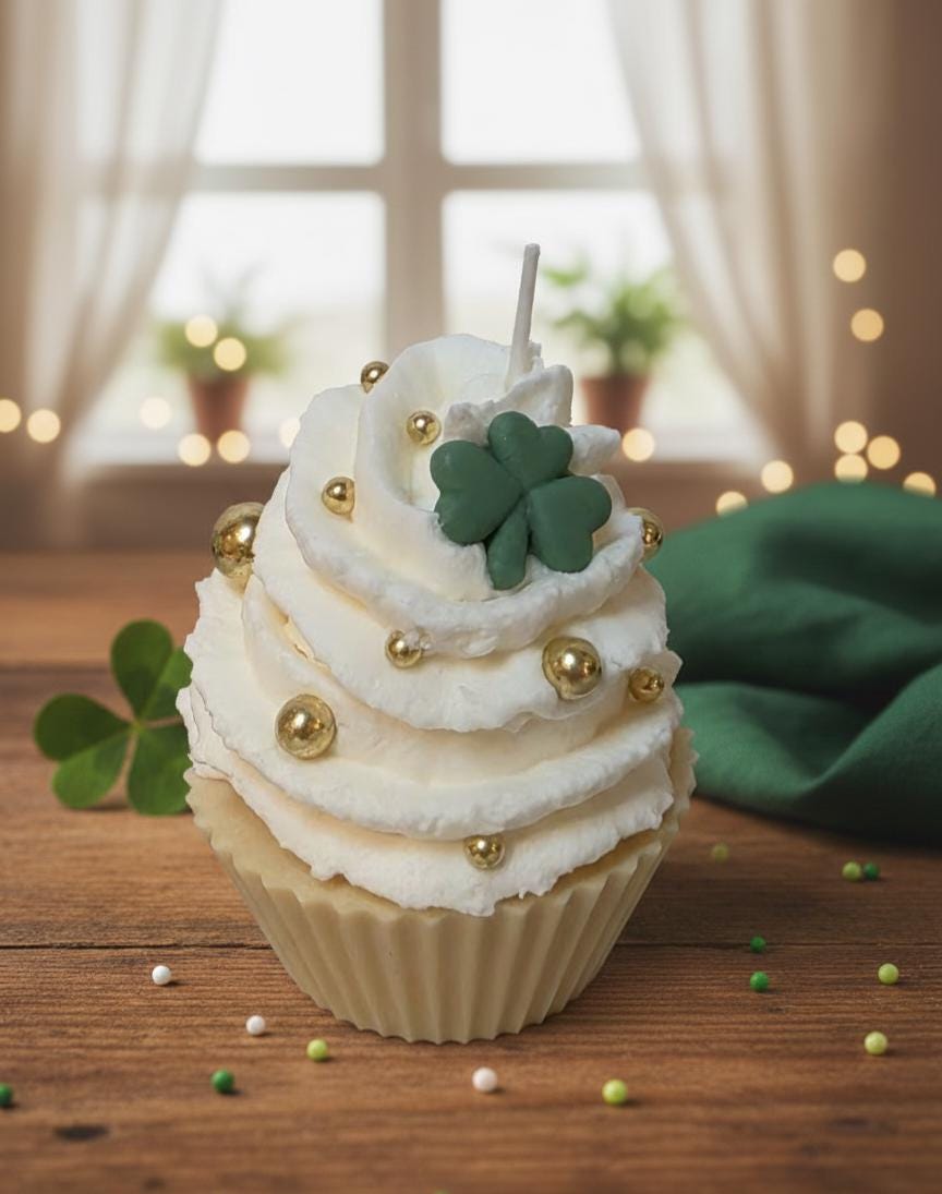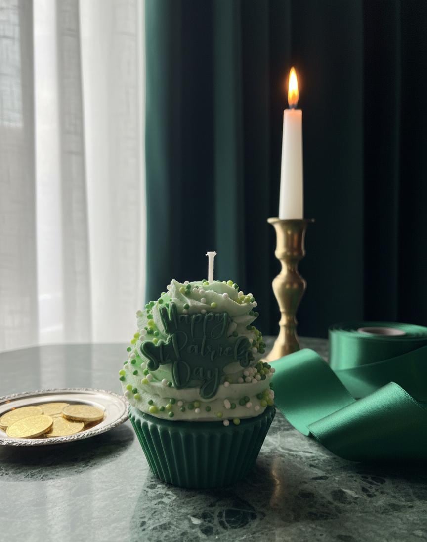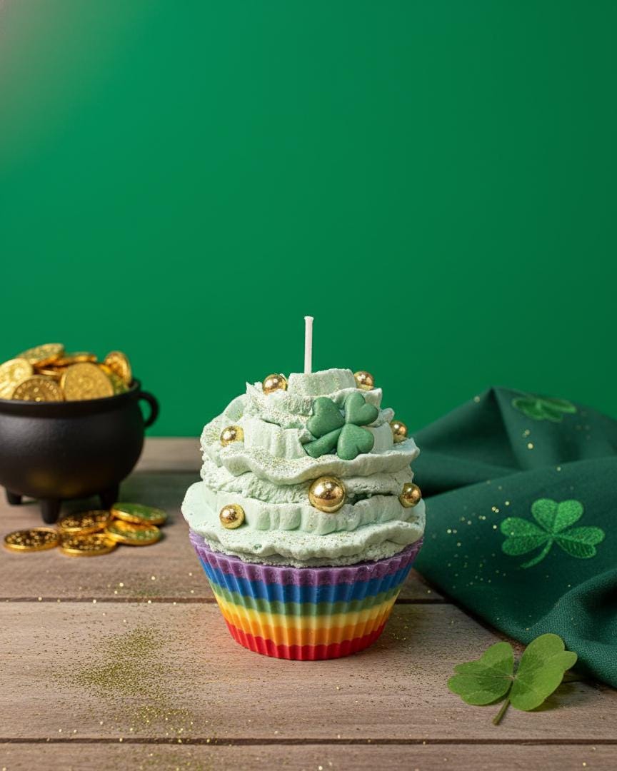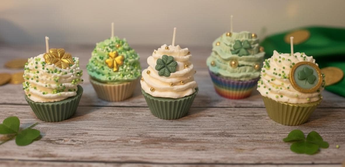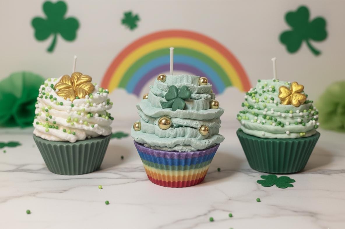 Bring a touch of Irish magic and a whole lot of sweetness to your home this March! These aren't your average cupcakes—they are meticulously hand-poured soy wax candles designed to look (and smell) good enough to eat. From the "pot of gold" rainbow bases to the festive shamrock embeds, these candles are the ultimate treat for your tiered tray, office desk, or as a "pinch-proof" gift for someone special.